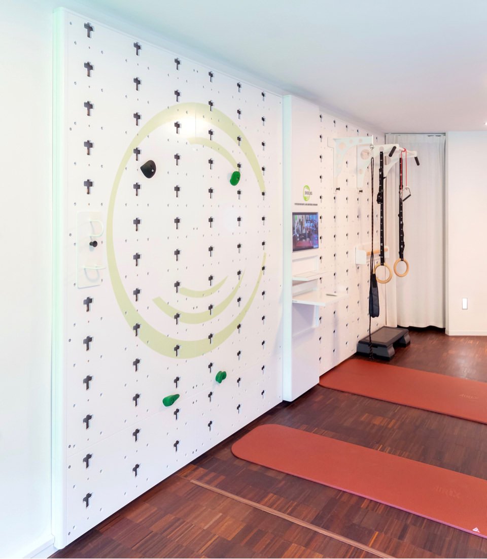 Unsere neue, individuell für jede Therapie einsetzbare DISCUS-Trainingswand bietet tolle Möglichkeiten, das muskuläre Zusammenspiel in Form von natürlichen Bewegungsabläufen einzusetzen und zu optimieren. Es lassen sich viele zusätzliche Adaptionen anbringen wie auch Einstellungen vornehmen, um die Trainingsumgebung perfekt an die unterschiedlichsten Anforderungen anzupassen.
